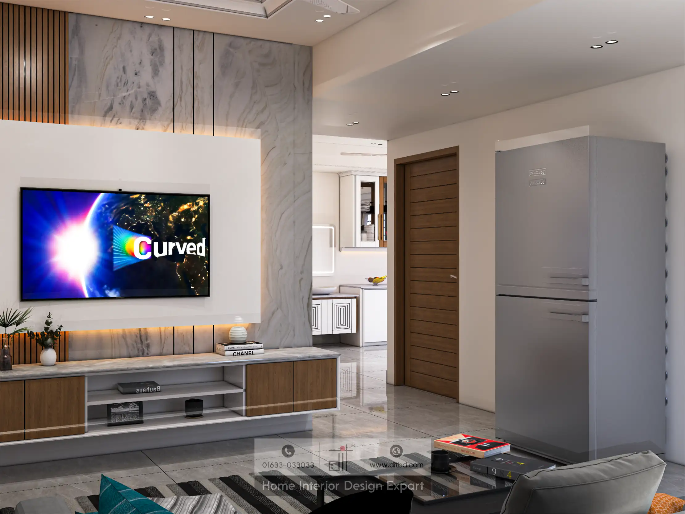 This is a luxury living room design with modern elegance. The room is decorated with a neutral color palette of grey, white, and beige, providing a sophisticated backdrop. A grey sofa and matching armchair are positioned around a glass coffee table, creating a comfortable seating area for socializing or relaxing. The wall behind the TV features marble-patterned panels, adding a touch of luxury, while decorative panels and potted plants enhance the aesthetic appeal. Large windows with sheer curtains allow natural light to flood the room, creating an airy and inviting atmosphere. The ceiling is equipped with recessed lighting and a ceiling fan for both ambiance and comfort. Wooden double doors with glass panels add warmth and lead to adjacent spaces, making the room feel connected yet distinct. An air conditioning unit ensures a comfortable temperature year-round. The overall design combines modern and elegant elements, creating a luxurious and functional living space ideal for relaxation, entertainment, and gatherings. This layout enhances the room’s aesthetic appeal while providing a comfortable and stylish environment for various activities.