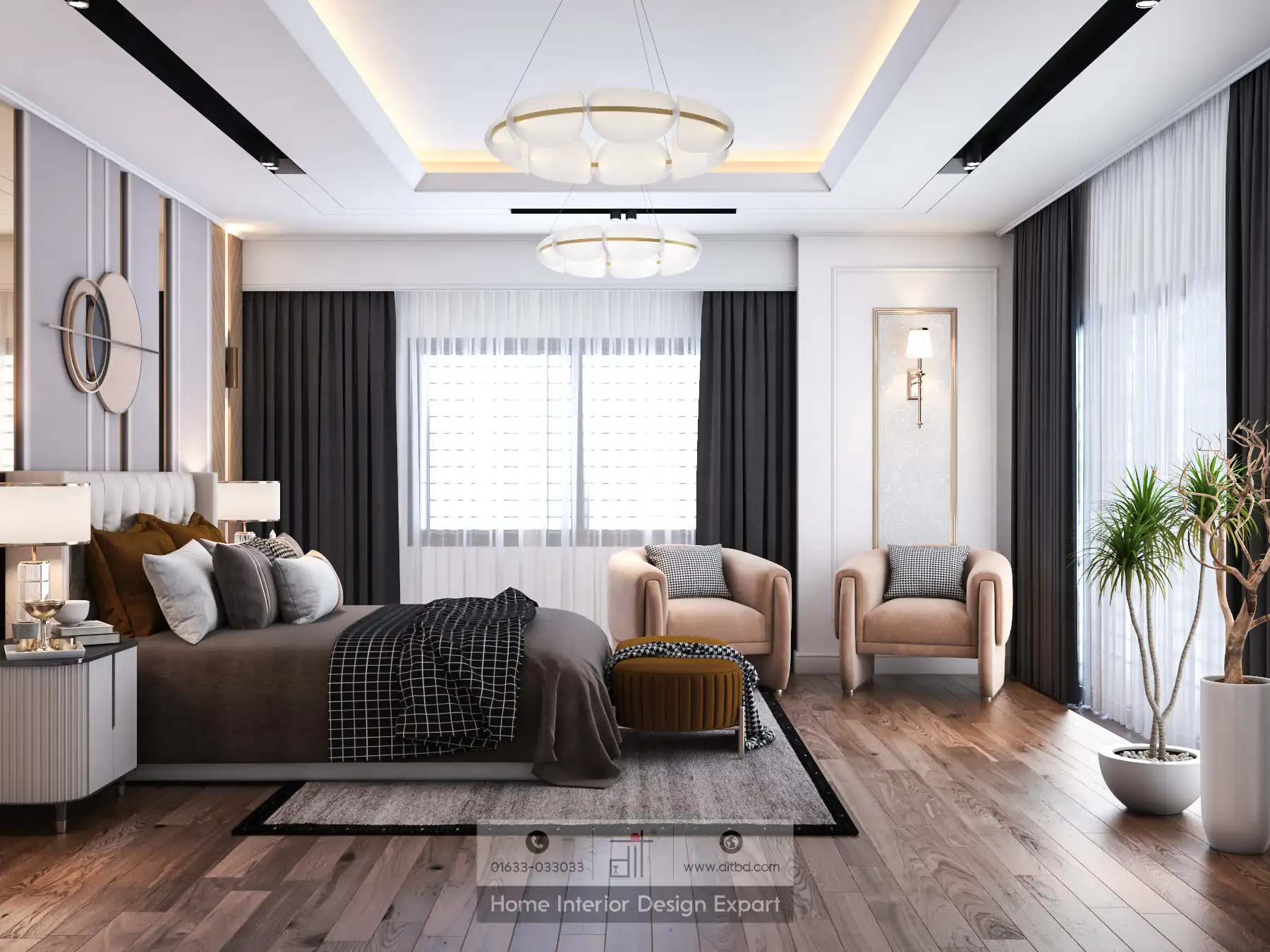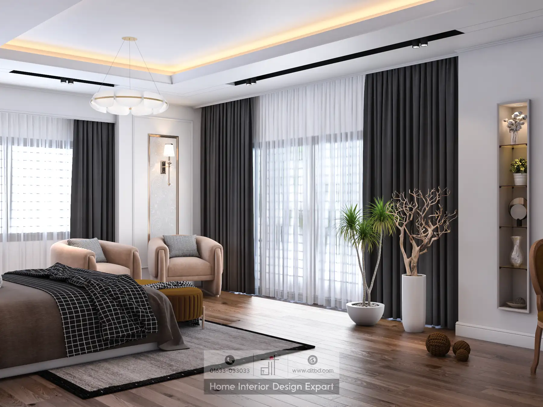 This luxurious boys’ bedroom is a blend of sophisticated visual and elegant features, designed to create a comfortable retreat. The centerpiece is a large bed with a padded headboard, providing both style and comfort. The bed is dressed in high-quality bedding with a neutral color palette, creating a serene and restful ambiance.