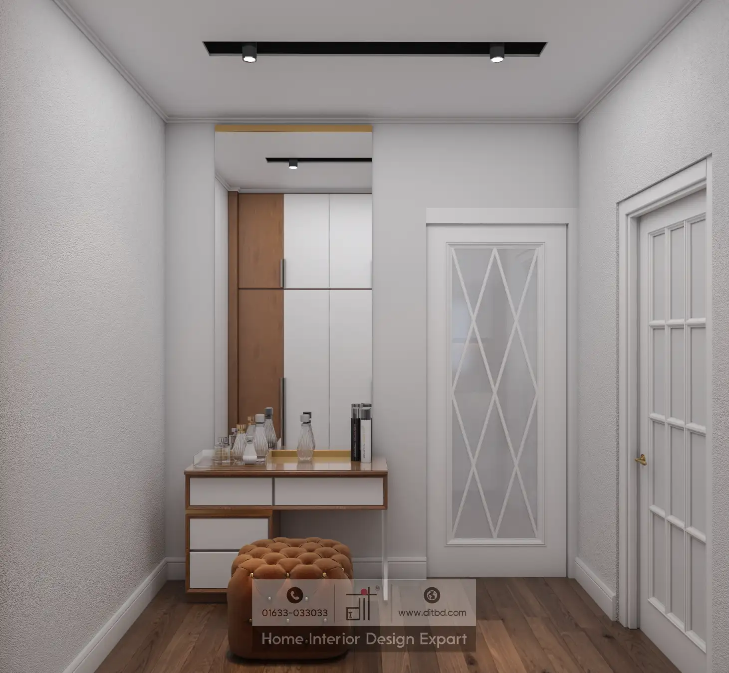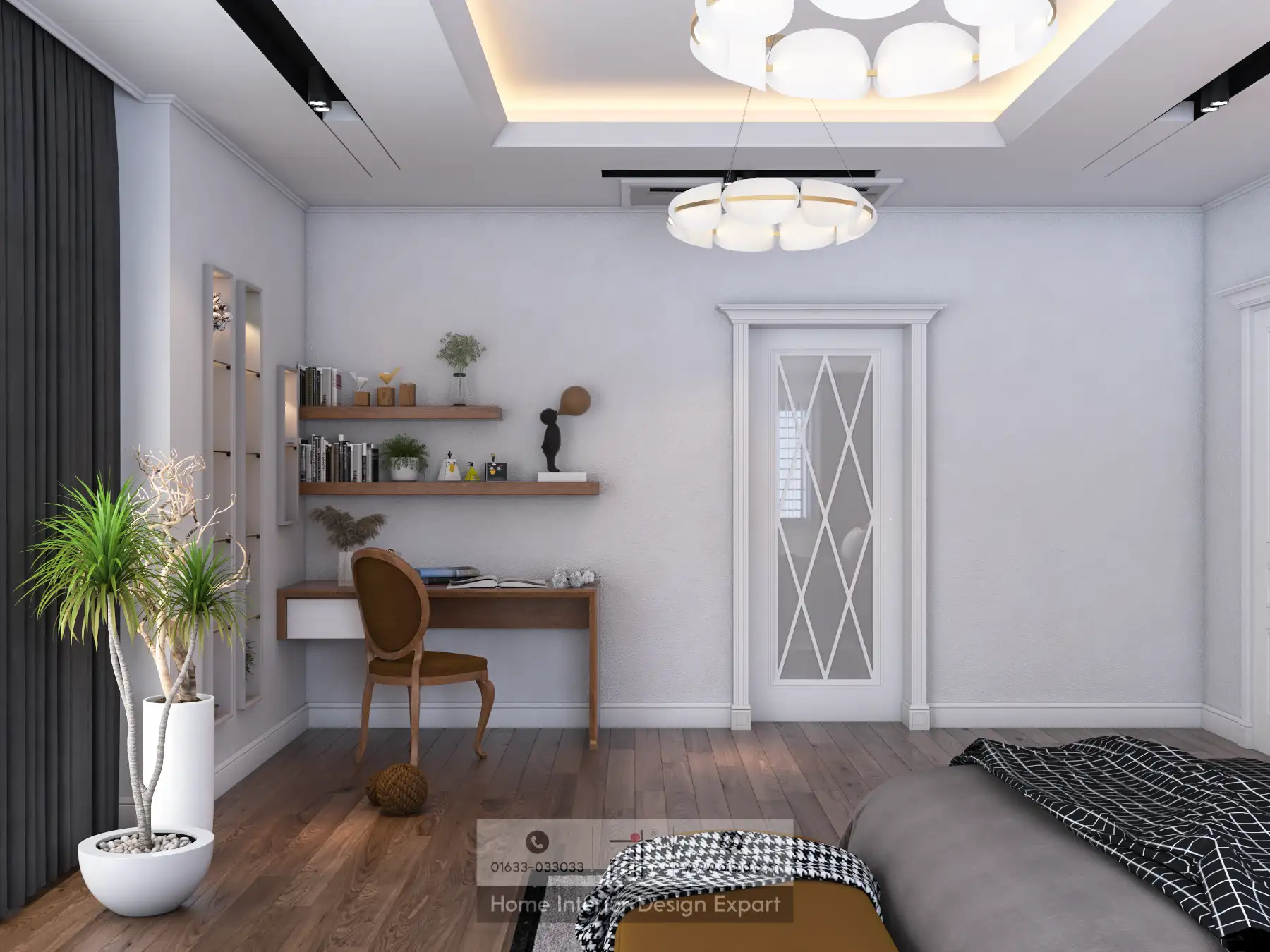 The ceiling is adorned with recessed lighting and a contemporary chandelier, adding a luxurious feel to the room. The wooden flooring brings warmth and complements the overall design. This boys’ bedroom is not only visually appealing but also practical, offering a perfect balance of style and functionality.