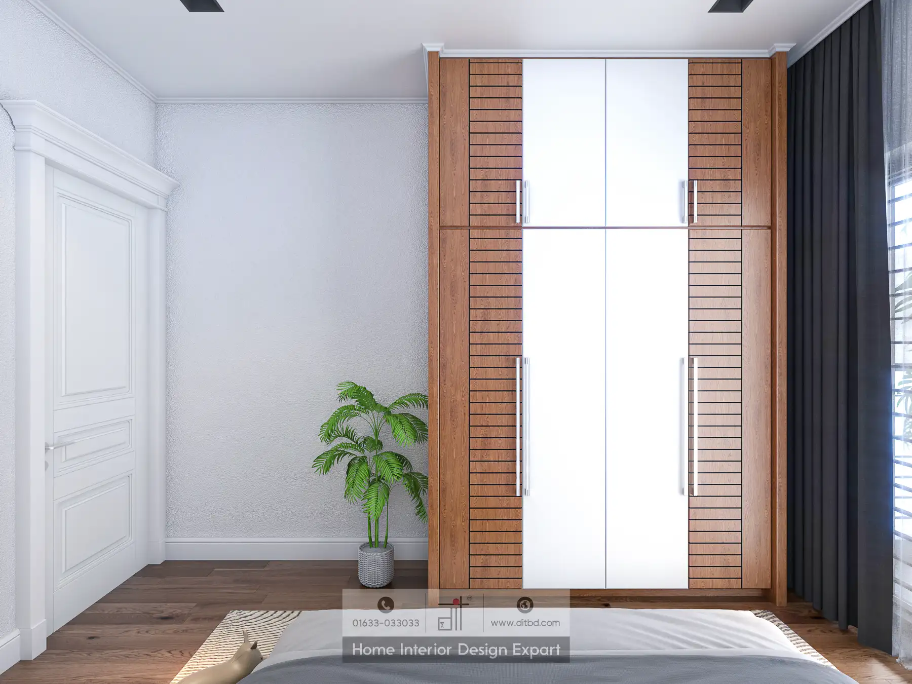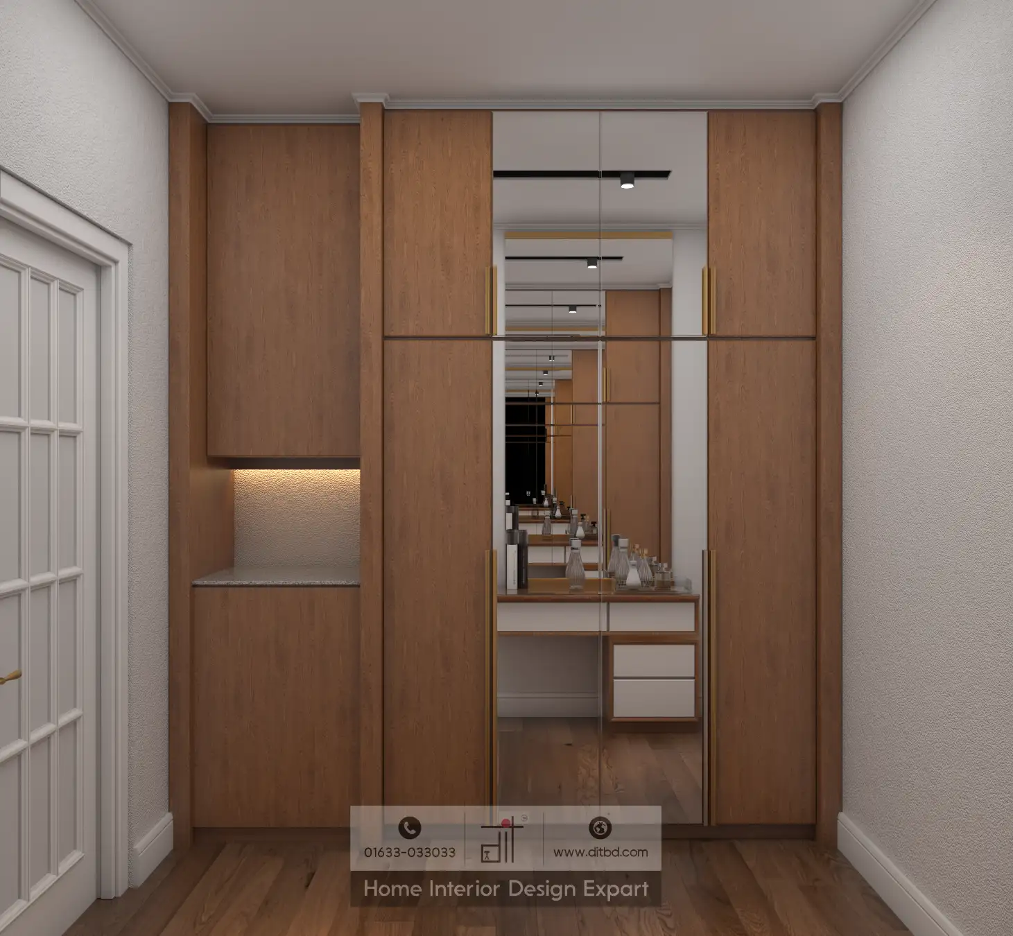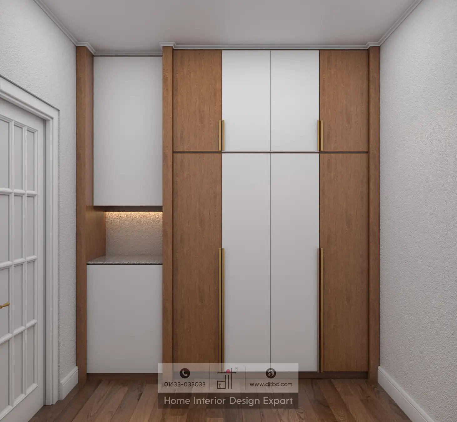 The luxury closet design showcases a sophisticated and functional space, designed to provide ample storage while maintaining an elegant aesthetic. The closet features a combination of white and wooden elements, creating a clean and minimalist look. The use of sleek, paneled doors with gold handles adds a touch of opulence, while the central mirrored section enhances the sense of space and light.