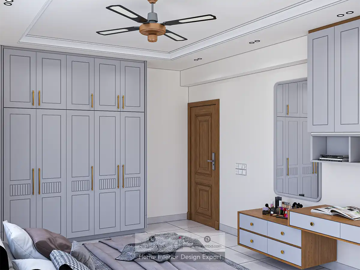 The sleek vanity area, complete with a large round mirror, offers you a dedicated space for grooming and accessorizing, adding a touch of elegance to the overall design. The closet’s elegant design elements, such as gold handles and a combination of wood and glass materials, create a luxurious and timeless look that will enhance your home interior.