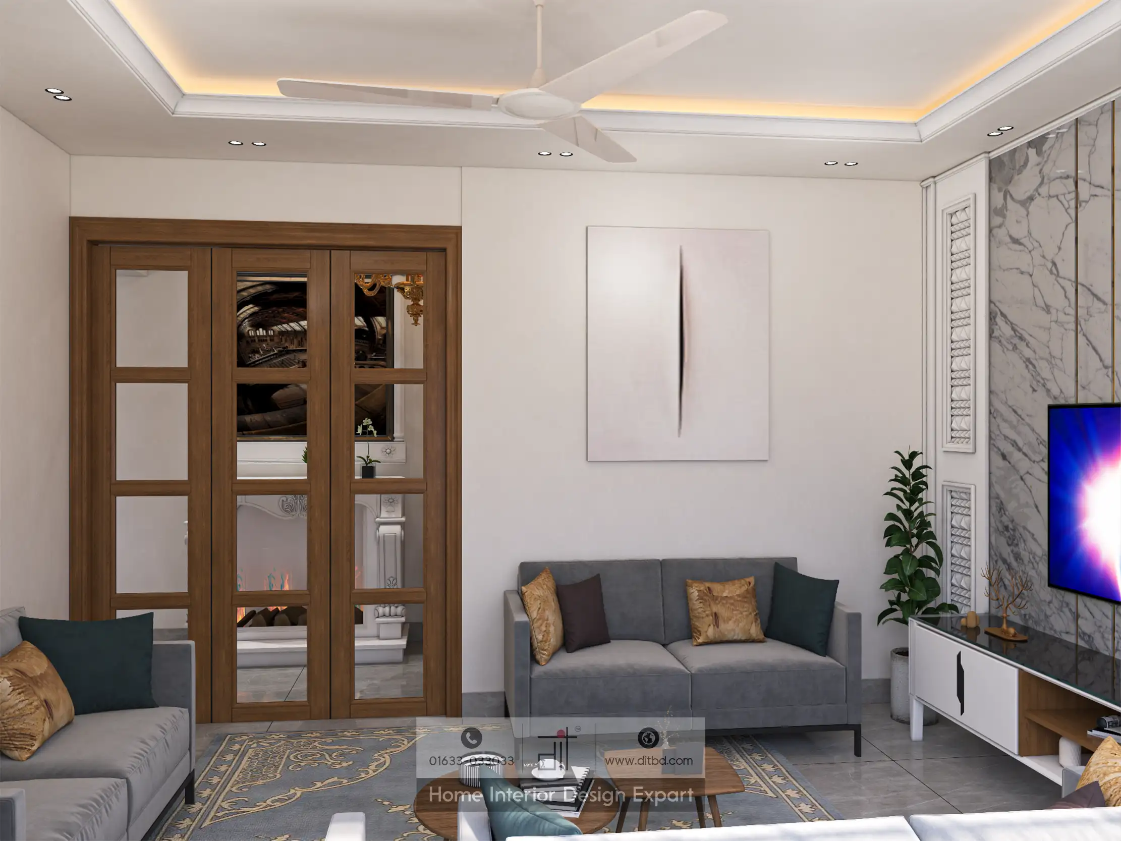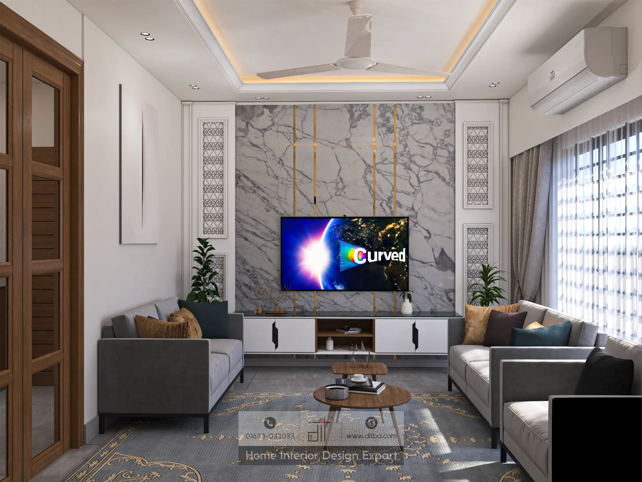 This is a luxury living room design with modern elegance. The room is decorated with a neutral color palette of grey, white, and beige, providing a sophisticated backdrop. A grey sofa and matching armchair are positioned around a glass coffee table, creating a comfortable seating area for socializing or relaxing. The wall behind the TV features marble-patterned panels, adding a touch of luxury, while decorative panels and potted plants enhance the aesthetic appeal. Large windows with sheer curtains allow natural light to flood the room, creating an airy and inviting atmosphere. The ceiling is equipped with recessed lighting and a ceiling fan for both ambiance and comfort. Wooden double doors with glass panels add warmth and lead to adjacent spaces, making the room feel connected yet distinct. An air conditioning unit ensures a comfortable temperature year-round. The overall design combines modern and elegant elements, creating a luxurious and functional living space ideal for relaxation, entertainment, and gatherings. This layout enhances the room’s aesthetic appeal while providing a comfortable and stylish environment for various activities.