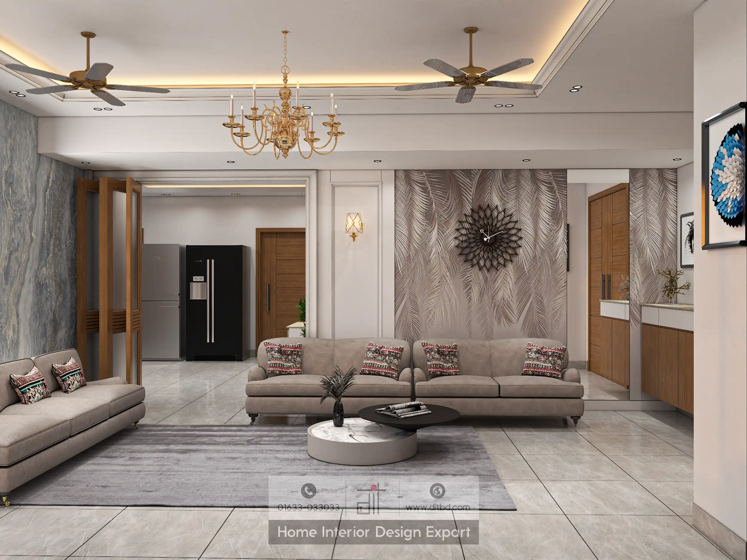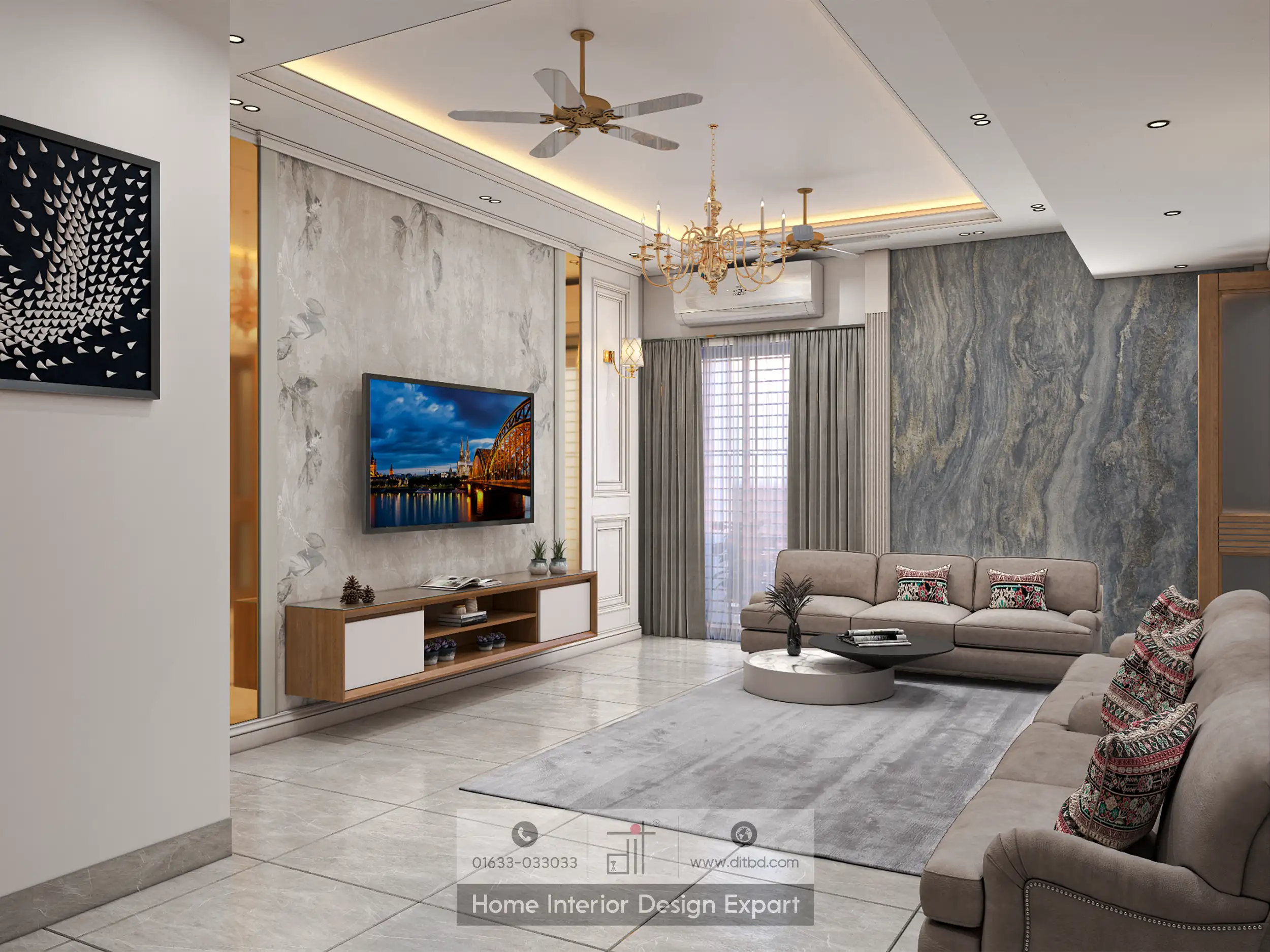The living room design is the epitome of modern elegance and sophistication. It features a spacious layout with plush, dark-colored sectional sofas adorned with intricate patterns, inviting relaxation and conversation. The central coffee table, with its sleek white marble top, adds a touch of sophistication and serves as a stylish focal point. The large flat-screen TV is mounted on a beautifully textured accent wall, creating an ideal spot for entertainment and relaxation. Below the TV, a minimalist white console with wooden accents provides ample storage for media essentials and decorative items, enhancing the room’s aesthetic appeal.