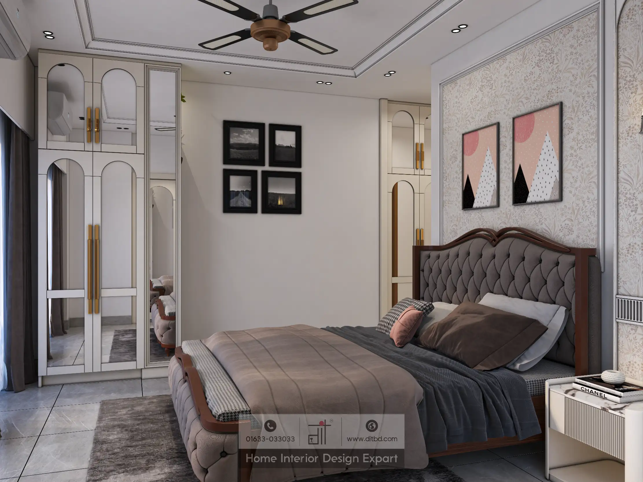 The room also features a series of framed artworks and photographs on the walls, adding a personal touch and visual interest. The overall design of DIT Studio’s minimal bedroom is a perfect blend of functionality, comfort, and style, making it an ideal retreat for rest and relaxation.