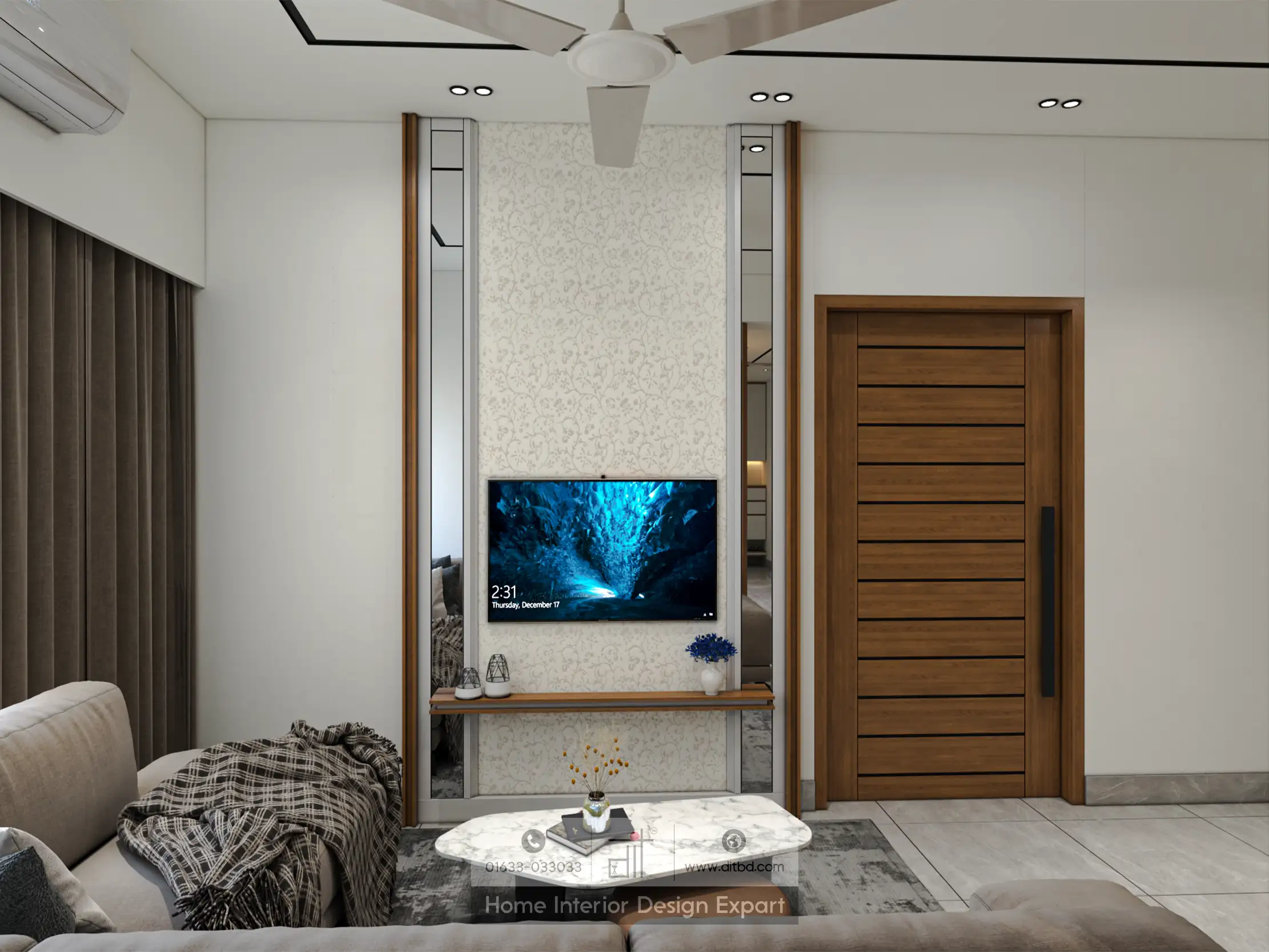 A built-in entertainment unit houses a flat-screen television, framed by vertical wooden themed panels that add a sense of height and structure to the room. The unit also features open shelving for decorative items and storage. The design incorporates natural wood elements, seen in the door and paneling, which bring warmth and a touch of nature indoors.