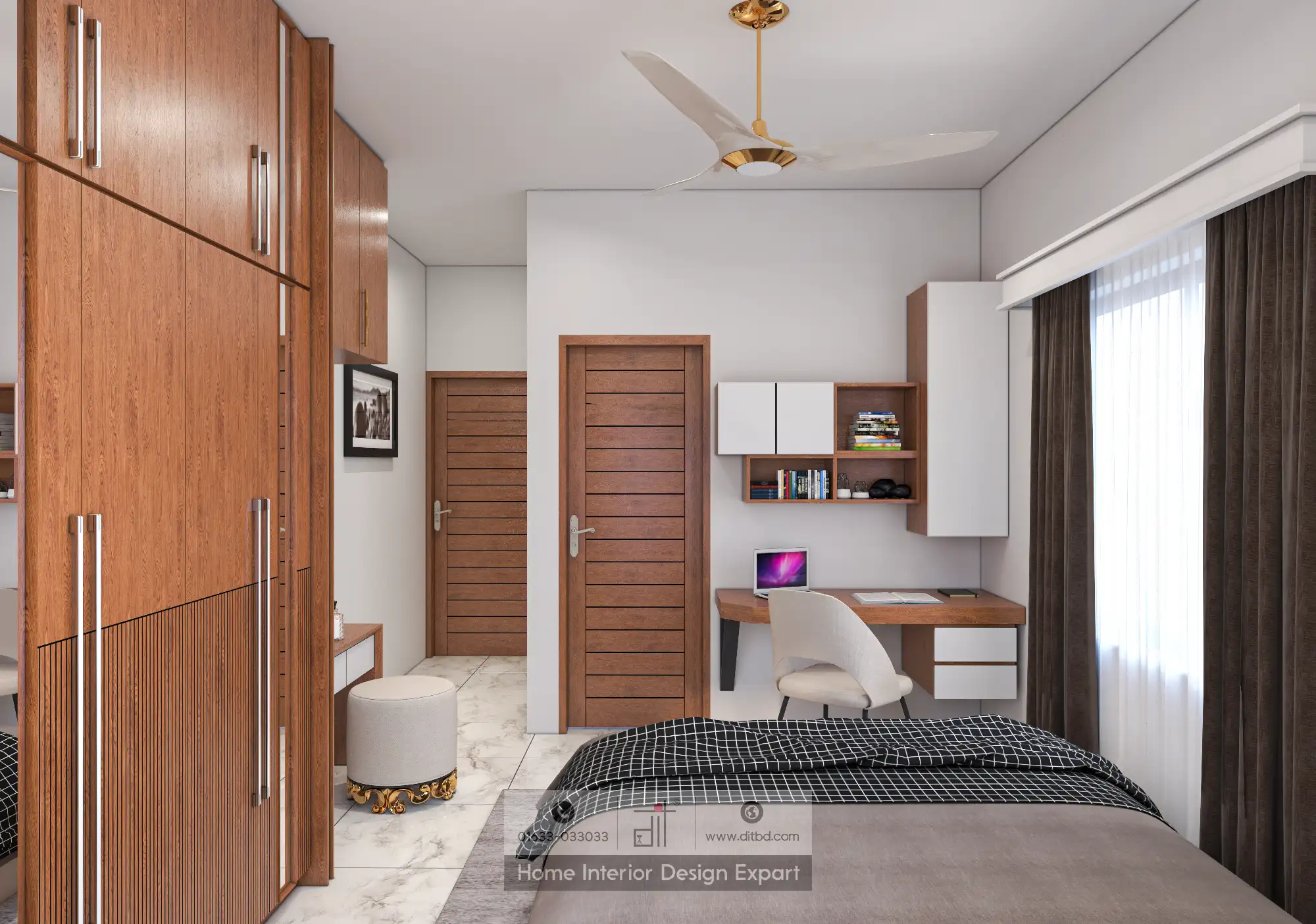The design of DIT Studio for a modern boy’s bedroom showcases a sophisticated and functional space. Your room features a neutral color palette with white walls and dark brown curtains that frame large windows, allowing natural light to flood the space. The bed, positioned centrally, is adorned with a checkered black and white bedspread and multiple pillows, providing both comfort and style that goes with the aesthetic values of contemporary boys.