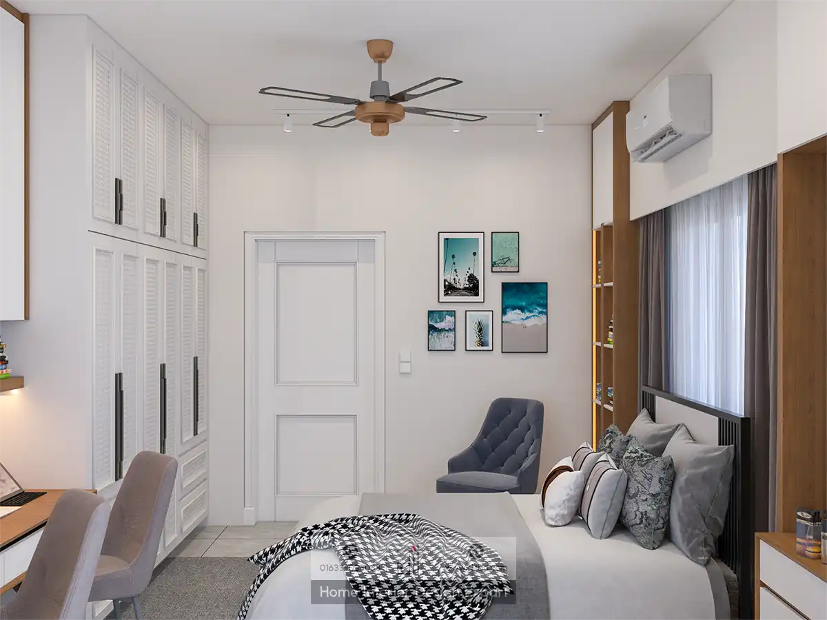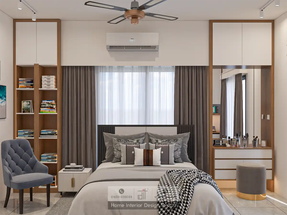 To the left of the bed, a cozy grey armchair and a small round side table provide a perfect spot for reading or relaxing. On the right side, a vanity area with a round mirror and a stool offers a functional space for grooming. The study area includes a desk, chair, and shelves filled with books and decor items, promoting a productive and organized environment.