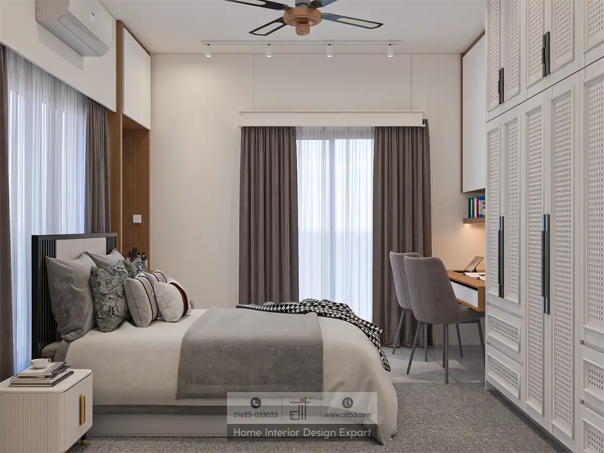 The wardrobe area features white paneled doors with long handles, providing ample storage space for clothes and accessories. The room is well-lit with recessed lighting and natural light from the window. The overall color scheme of neutral tones, accented with grey, white, and wood, creates a calm and inviting atmosphere, making it an ideal space for a child to grow and thrive.