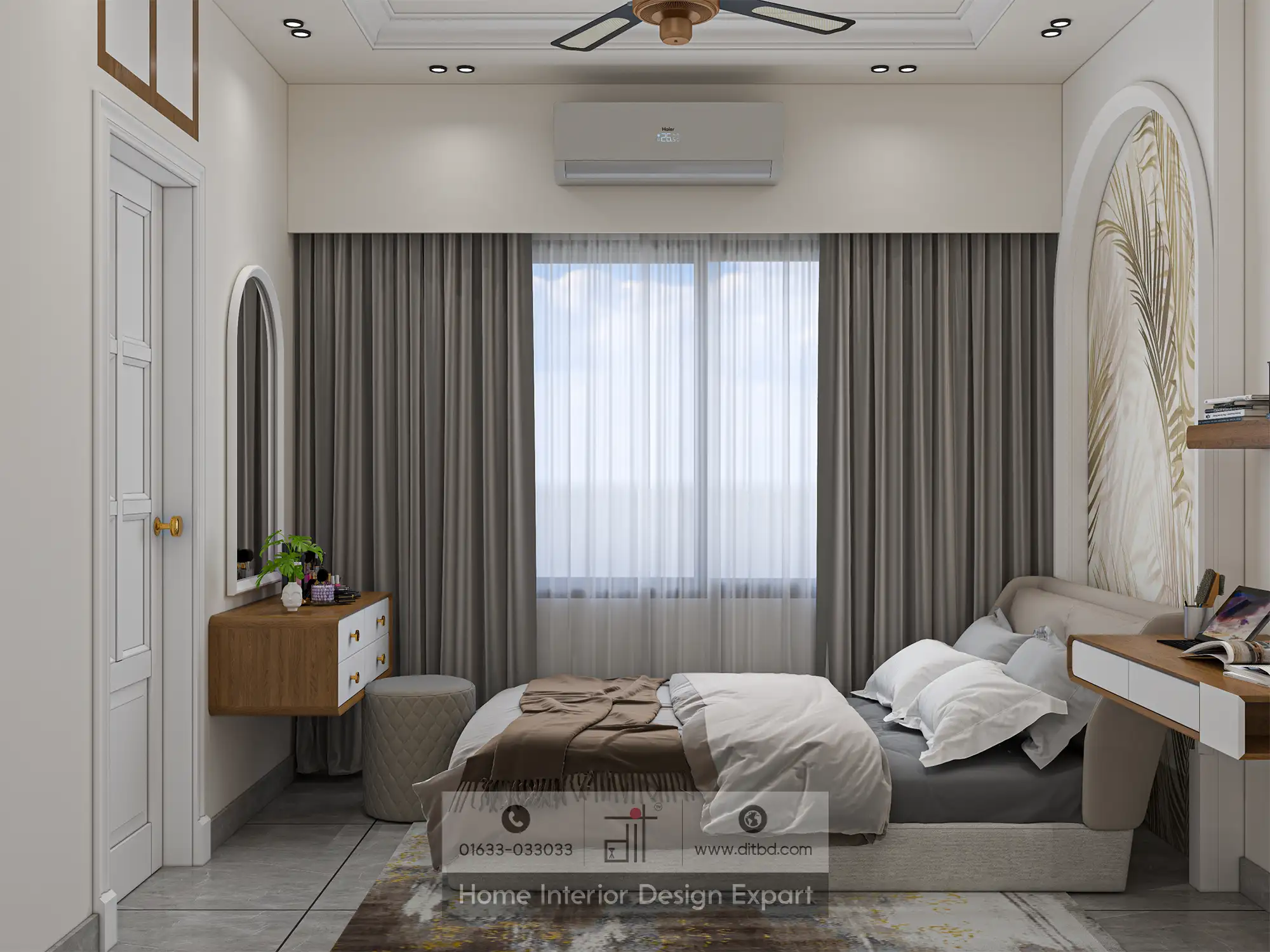 The room also features a spacious wardrobe with wooden doors, providing ample storage for guests. A ceiling with strategically placed recessed lighting adds a warm glow to the room. A small vanity area with a mirror and a potted plant adds a personal touch, making the space feel more homely and welcoming. Overall, the design by DIT Studio is a perfect blend of style, comfort, and functionality, making it an ideal guest bedroom.