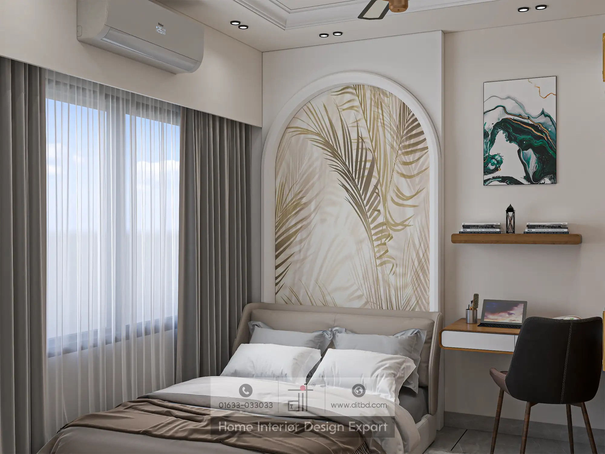 The modern guest bedroom design by DIT Studio showcases contemporary aesthetics and functional elements. The room features a soothing color palette dominated by neutral tones, which creates a calm and inviting atmosphere. The bed, positioned centrally, is adorned with crisp white linens and a soft beige throw, enhancing the room’s serene vibe. Above the bed, a large, elegant wall art piece with botanical motifs adds a touch of nature and sophistication to the space.