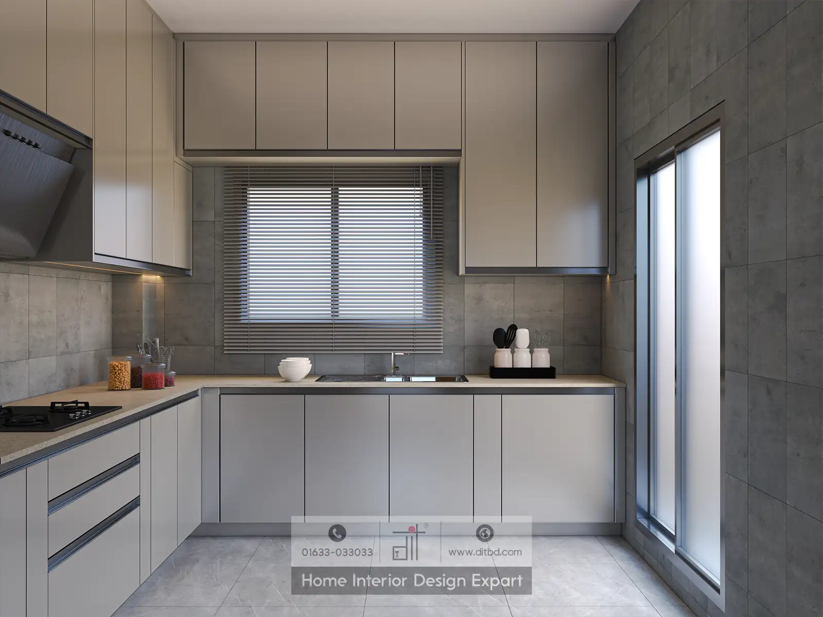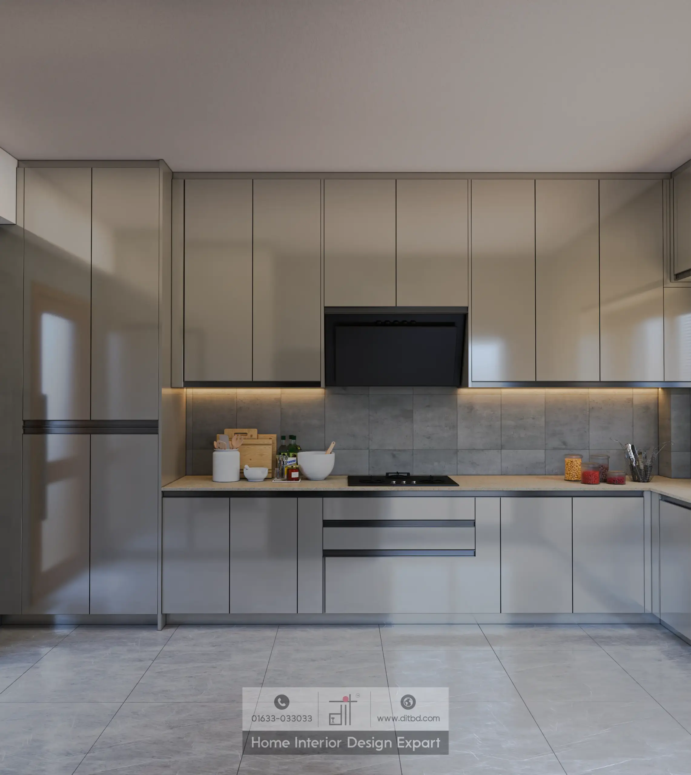 This is a modern kitchen design with a sleek and minimalist aesthetic. The kitchen features light grey, glossy cabinetry that extends from the floor to the ceiling, providing ample storage space and a clean, contemporary look. The countertops are a light, neutral color that complements the overall design.