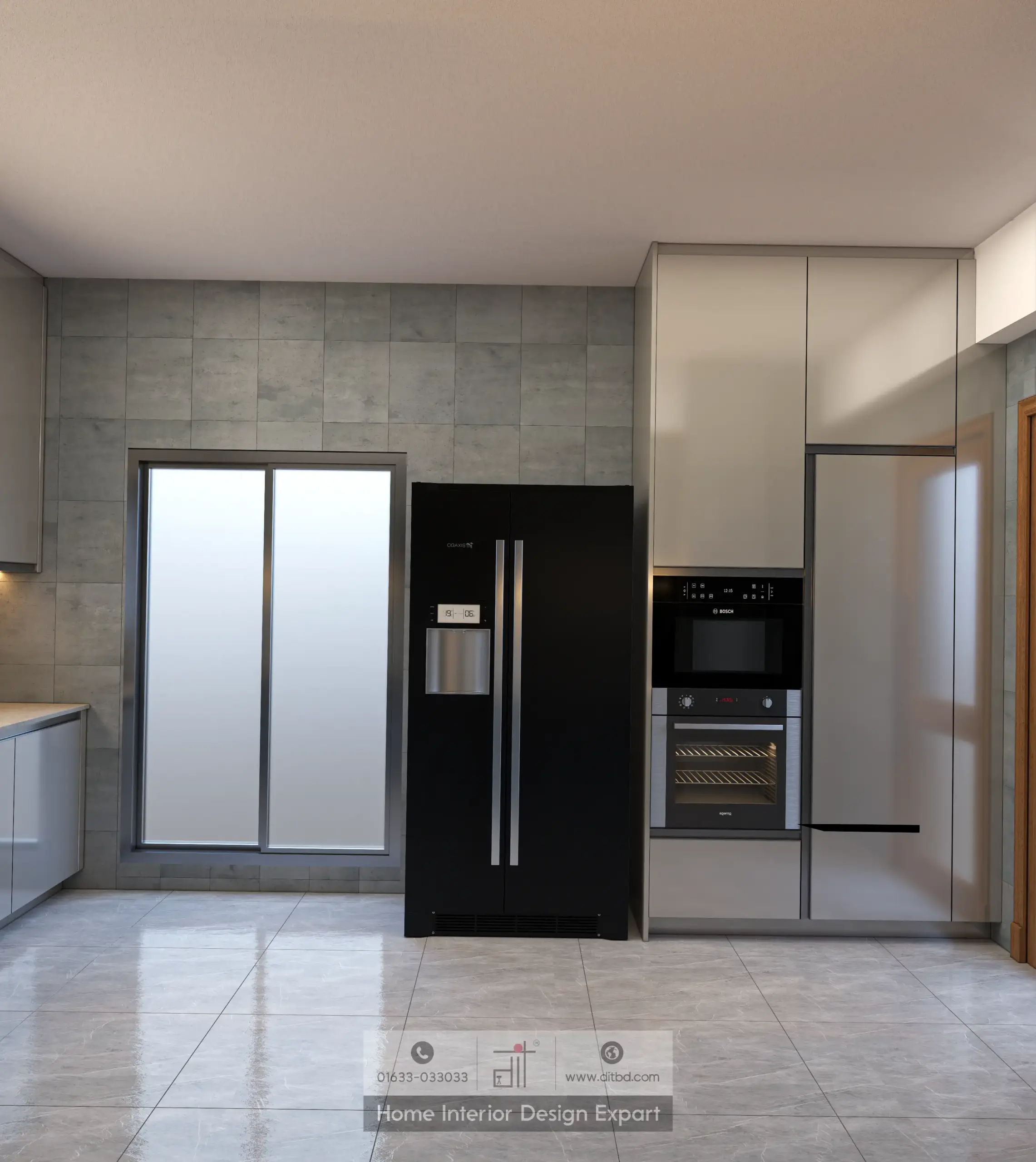 In one part of the kitchen, there is a built-in stovetop with a black range hood above it, and a backsplash with a subtle pattern. Small appliances and decorative items on the countertop add both functionality and style. Another section highlights a large, double-door refrigerator with a metallic finish, positioned next to a built-in oven and microwave. The kitchen floor is tiled with large, light-colored tiles, enhancing the spacious feel of the room.