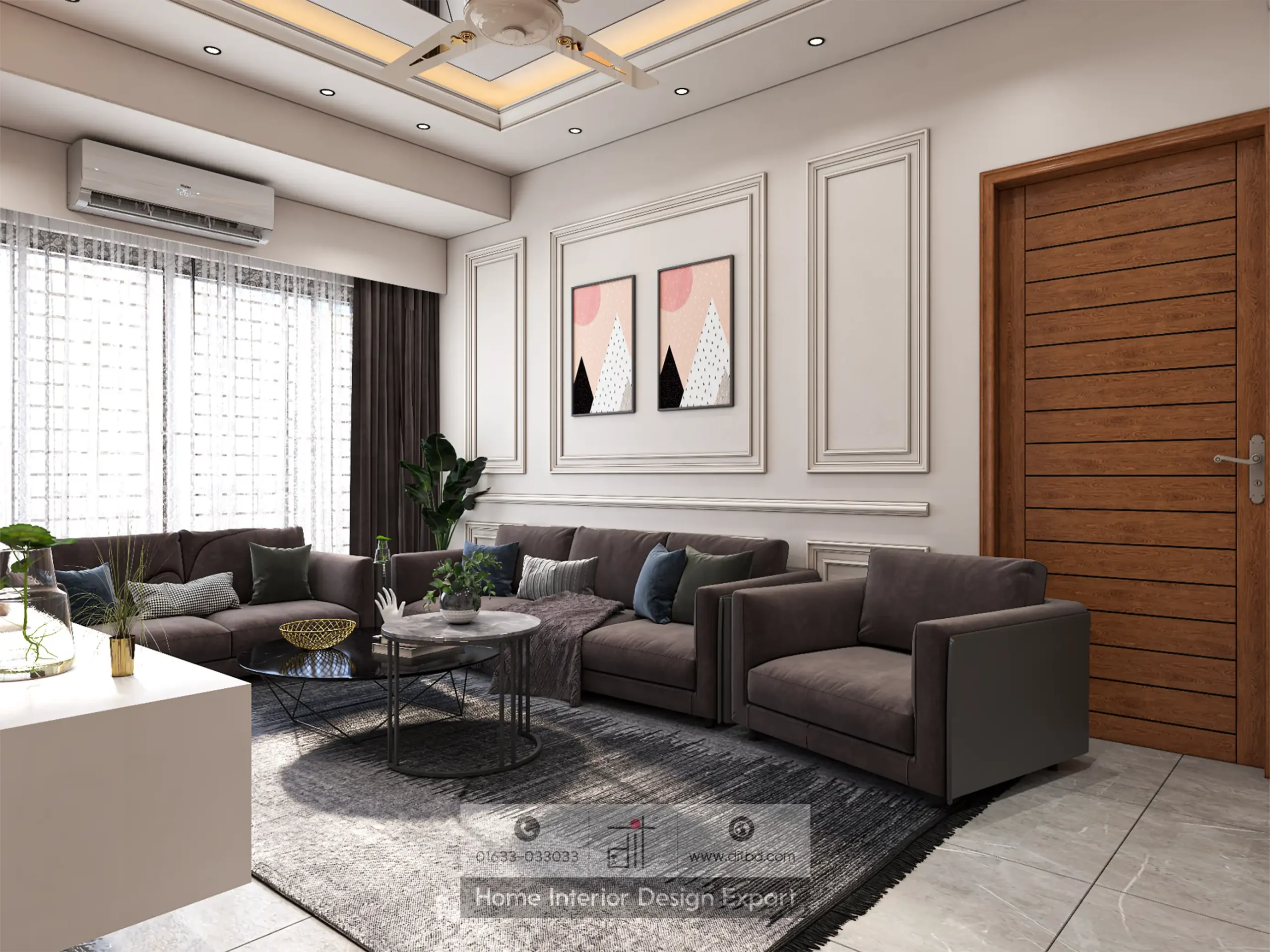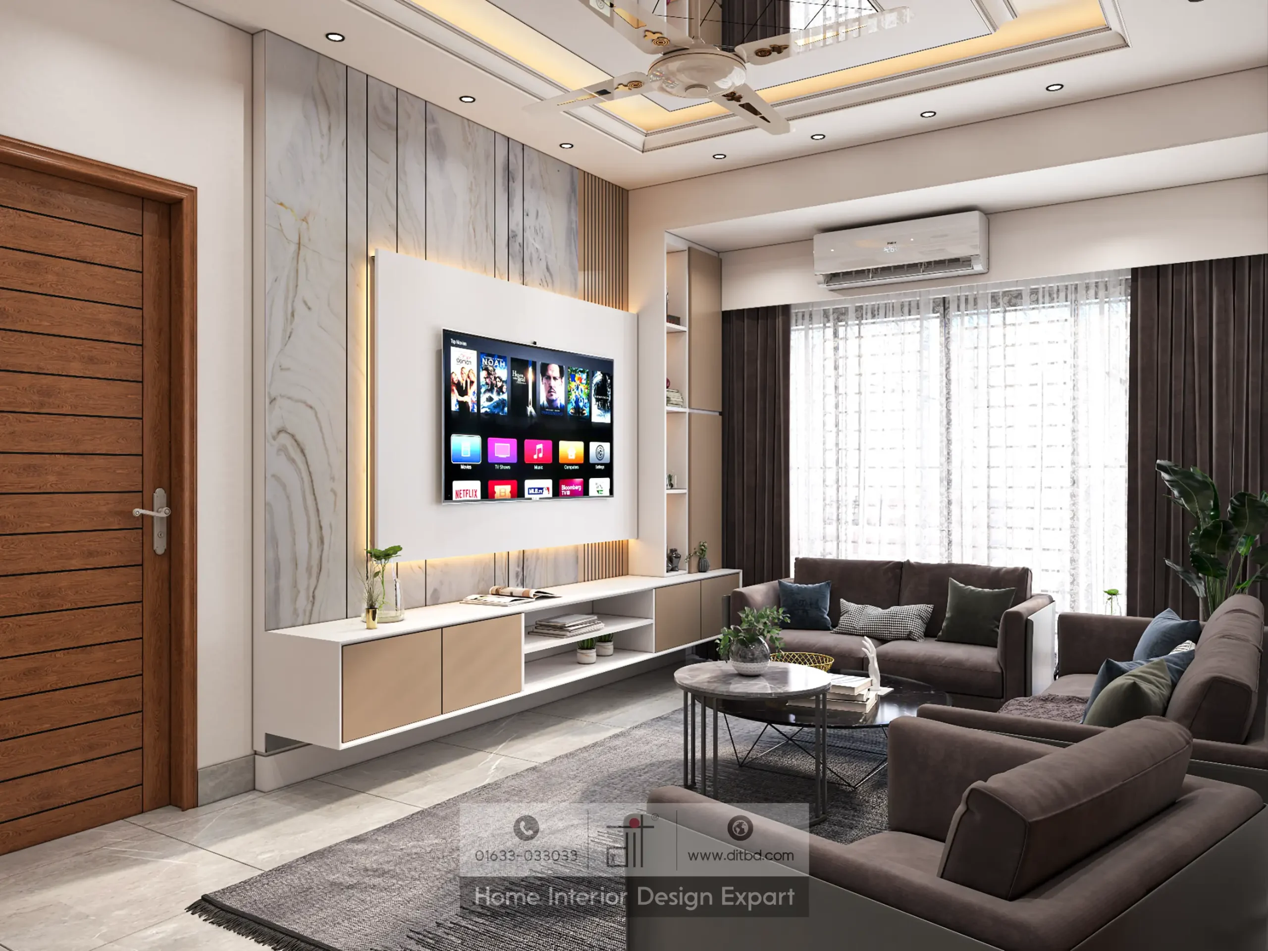 Also, the addition of indoor plants brings a touch of nature indoors, enhancing the overall sense of tranquility and well-being. To complete the look, a modern chandelier hangs from the ceiling, casting a warm, inviting glow over the entire room. This thoughtful design ensures that your living room is both a stylish retreat and a welcoming gathering place for family and friends.
