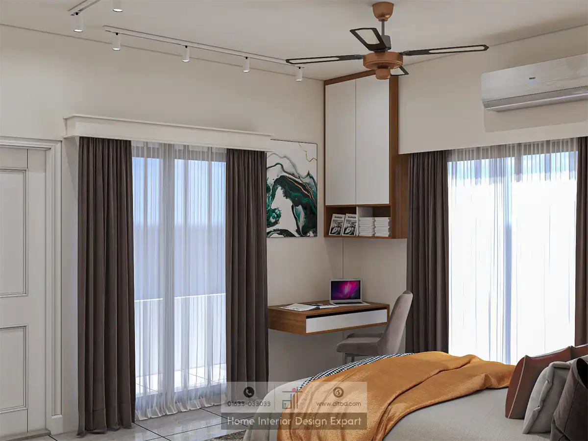 As you look around, the room includes a small vanity area with a mirror and a stool, perfect for your morning routine. There is also a built-in desk with a chair and shelves, offering a functional workspace within the comfort of your bedroom.